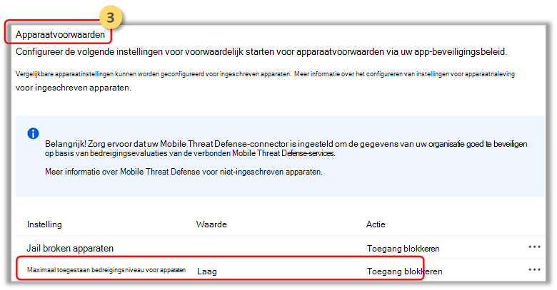 Om deze mogelijkheid in te schakelen, moet een beheerder de verbinding tussen Microsoft Defender voor Eindpunt en Intune configureren, het app-beveiligingsbeleid maken en het beleid toepassen op doelapparaten en toepassingen.