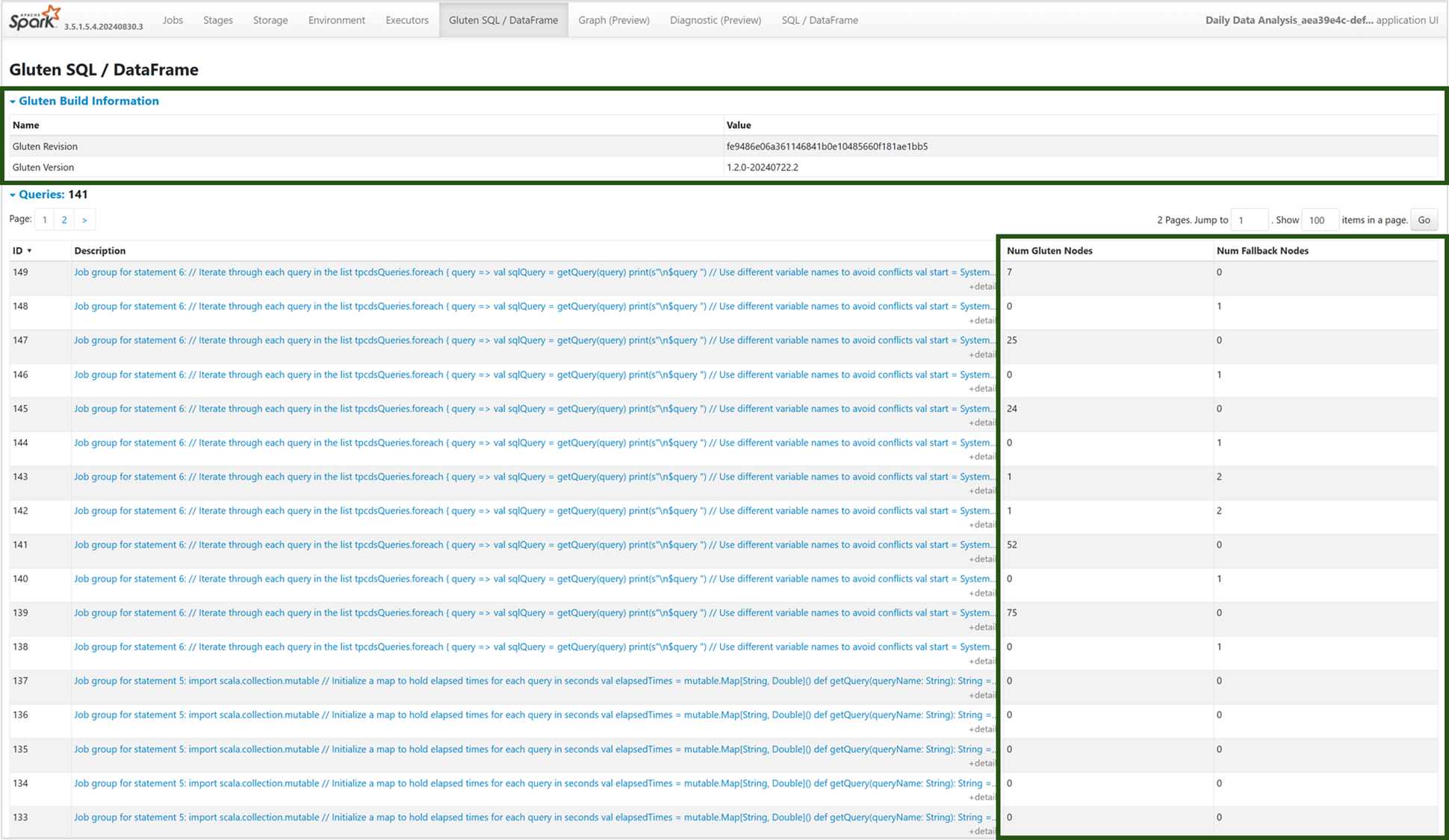U kunt naar het nieuwe tabblad Gluten SQL/DataFrame navigeren om de informatie over de glutenbuild weer te geven en details over de uitvoering van query's weer te geven. De tabel Query's biedt inzicht in het aantal knooppunten dat wordt uitgevoerd op de systeemeigen engine en de knooppunten die voor elke query terugvallen op de JVM.