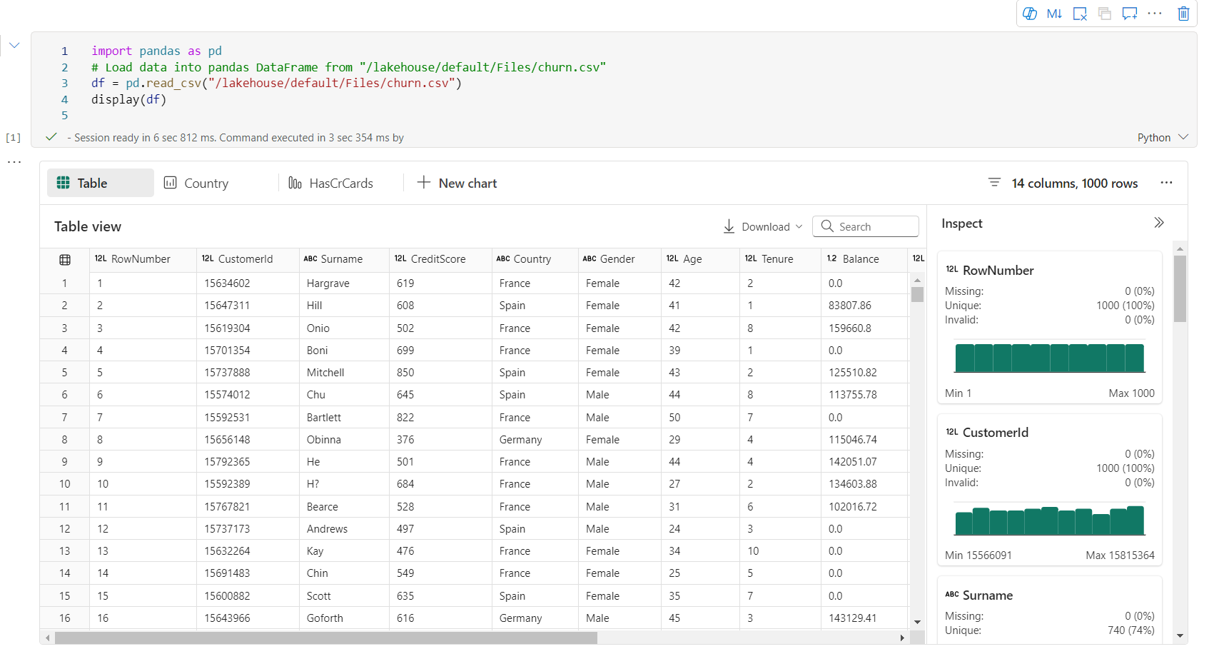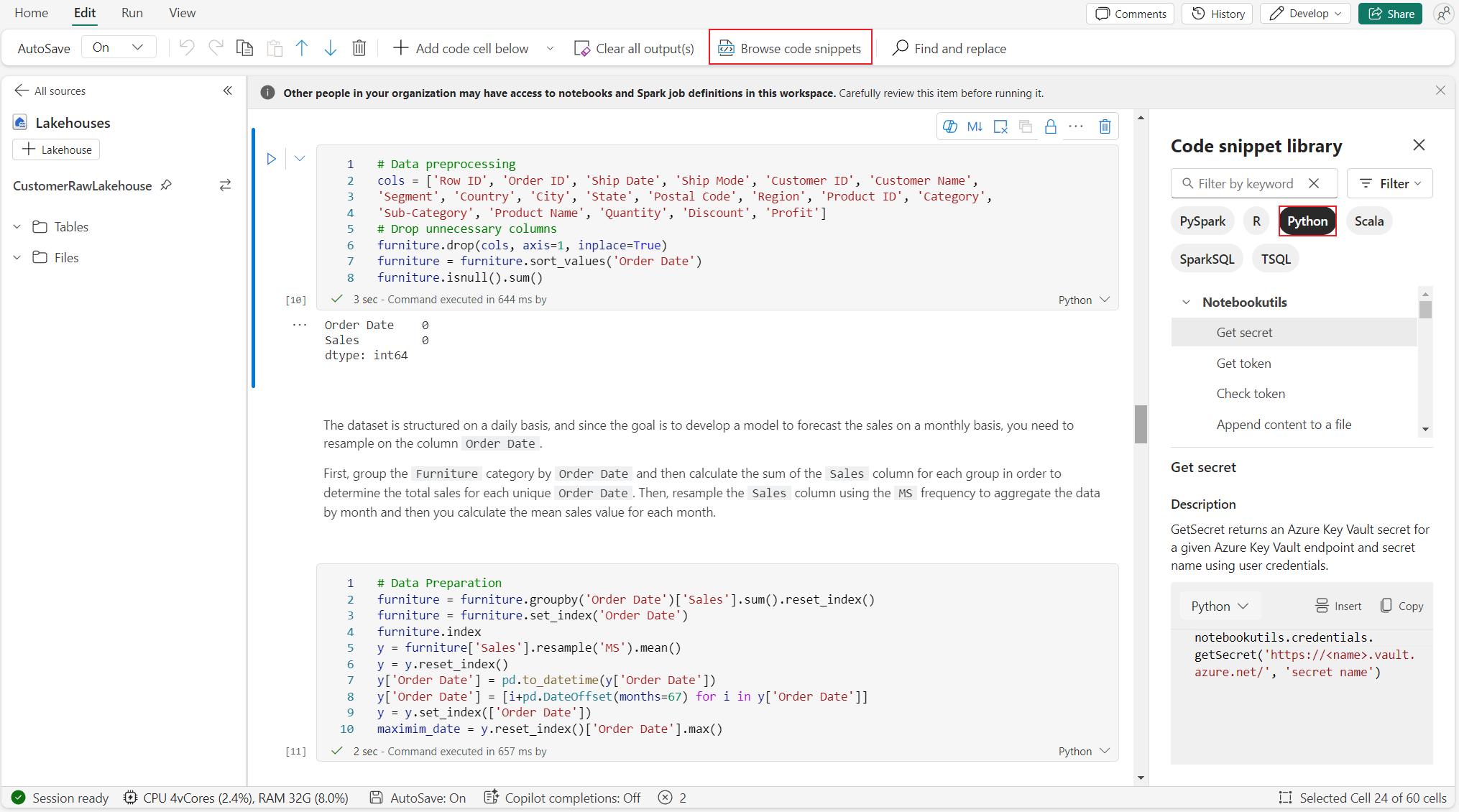Lakehouse & Resources zijn systeemeigen beschikbaar: De volledige functionaliteit van de Fabric Lakehouse samen met ingebouwde notebookresources is beschikbaar in de Python notebook. Met deze functie kunnen gebruikers de gegevens eenvoudig naar een python Notebook brengen. Probeer gewoon te slepen en neer te zetten om de codefragmenten op te halen.