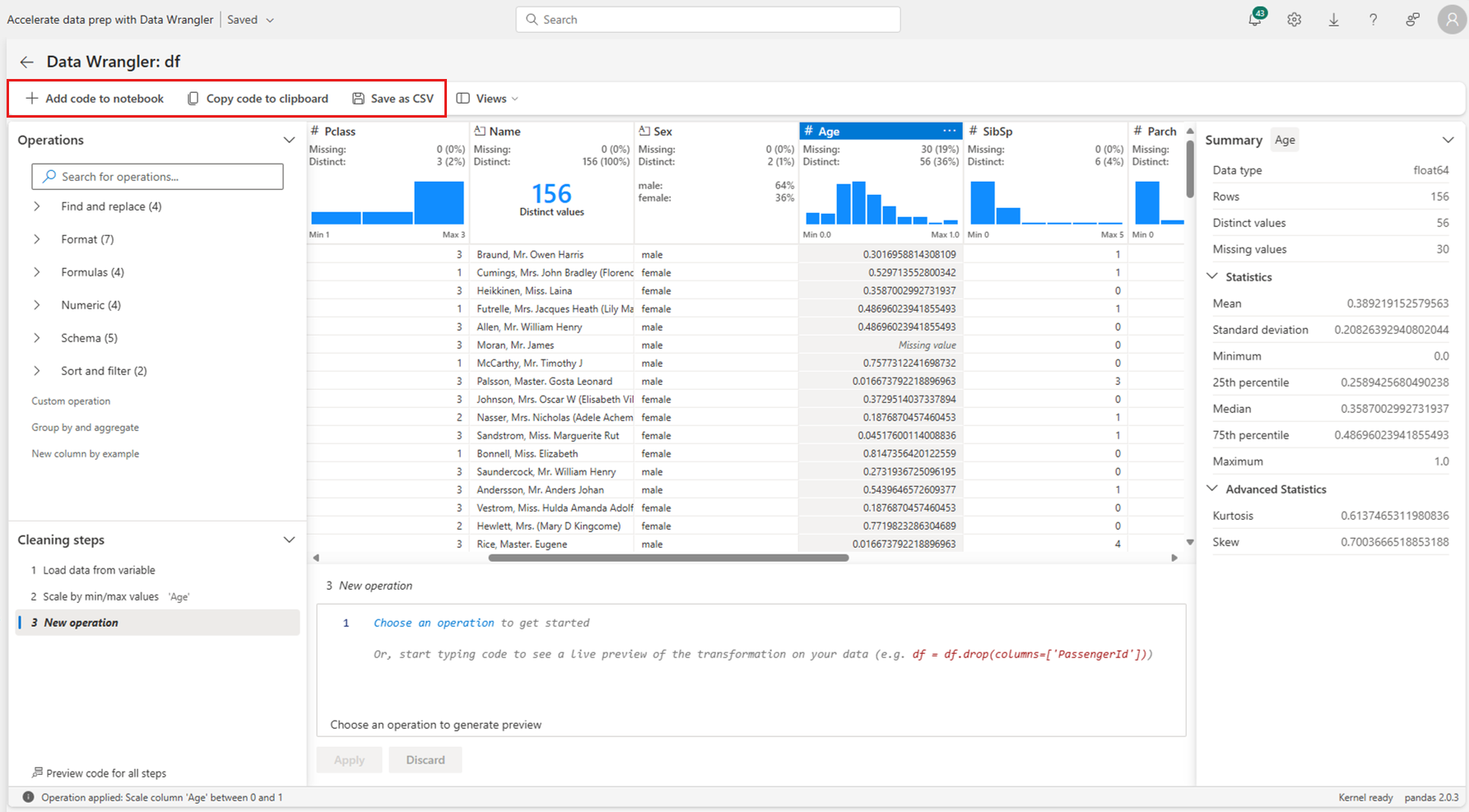 Data Wrangler genereert code die alleen wordt uitgevoerd wanneer u de nieuwe cel handmatig uitvoert en uw oorspronkelijke DataFrame niet overschrijft, zoals wordt weergegeven in deze schermopname: