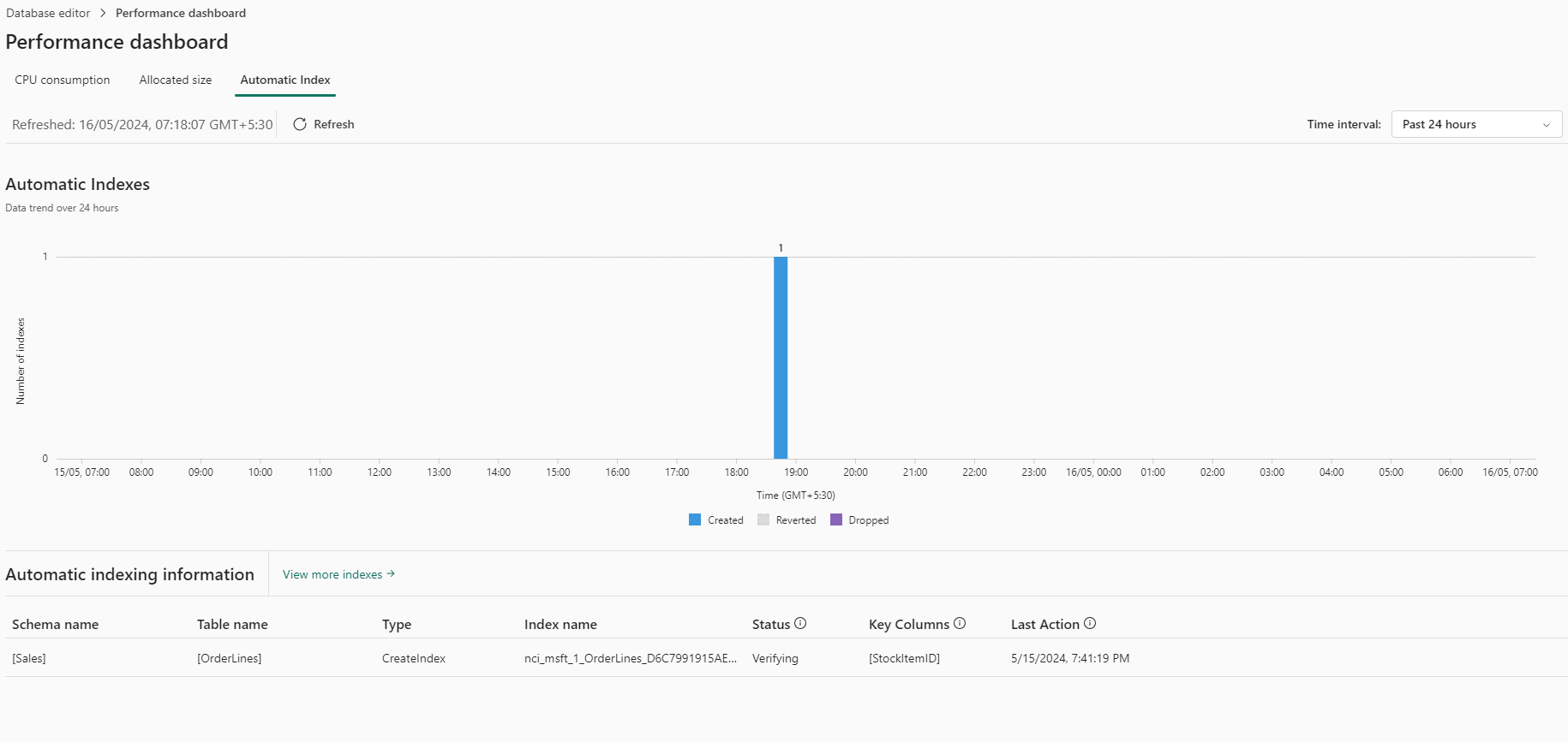 Het rapport Tabblad Automatische index bevat een geschiedenis en status van automatisch gemaakte indexen.