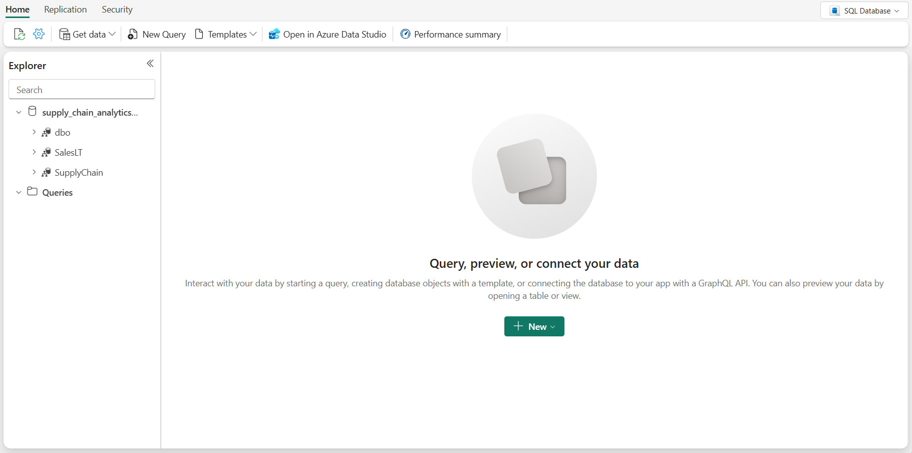 De webeditor voor SQL Database in Fabric biedt een fundamentele objectverkenner en een interface voor het uitvoeren van query's. In het menu geïntegreerde Explorer worden alle databaseobjecten weergegeven.