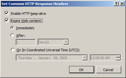 In the Set Common HTTP Response Headers dialog box, check the box to expire Web content, select Immediately, and then click OK.