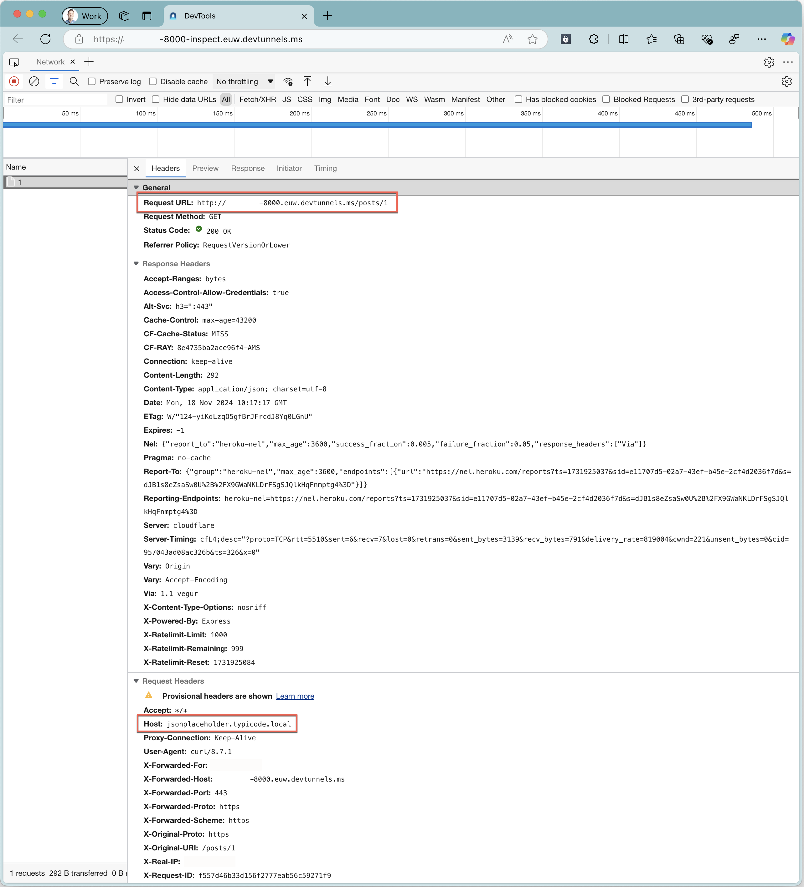 curl https://tunnel_id-8000.euw.devtunnels.ms/posts/1.In de webbrowser met Chrome Dev Tools ziet u de informatie over de onderschepte aanvraag en het antwoord van de cloud-API.