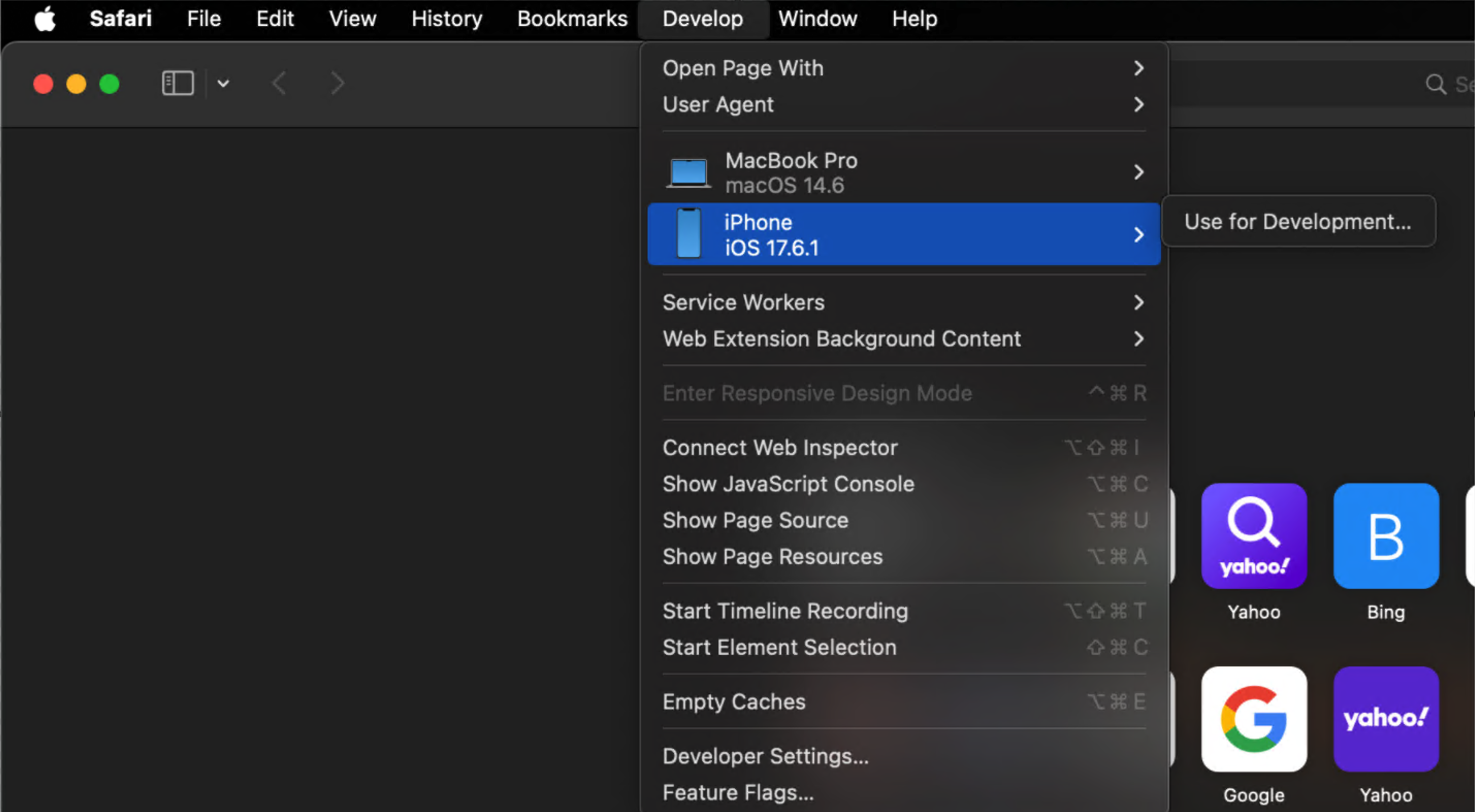From the Develop menu, select the connected iOS client to view the inspection link for your app.