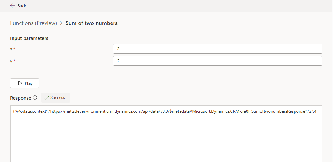 - Geef waarden op voor de invoerparameters die in de functie zijn gedefinieerd en selecteer vervolgens Afspelen.