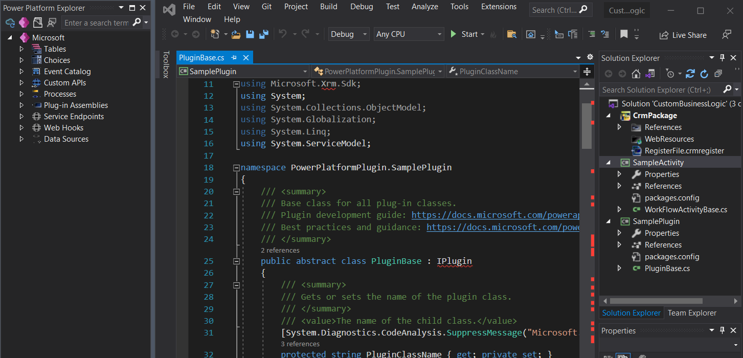 Power Platform Tools for Visual Studio supports the rapid creation, debugging, and deployment of plug-ins. Other capabilities include development of custom workflow activities, web resources, integration technologies like Azure Service endpoints and webhooks, and more.