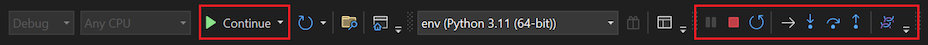 While the Debugger is running, step through the code with F10, or run the code from each breakpoint with F5. You can also use debugging controls on the main toolbar in Visual Studio, such as Continue, Stop, Restart, and Step options:
