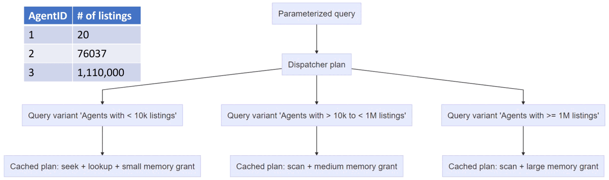 Voor in aanmerking komende plannen produceert de eerste compilatie een dispatcherplan dat de PSP-optimalisatielogica bevat, een dispatcherexpressie genoemd. Een dispatcherplan komt overeen met queryvarianten op basis van de grenswaarden voor kardinaliteitsbereiken.