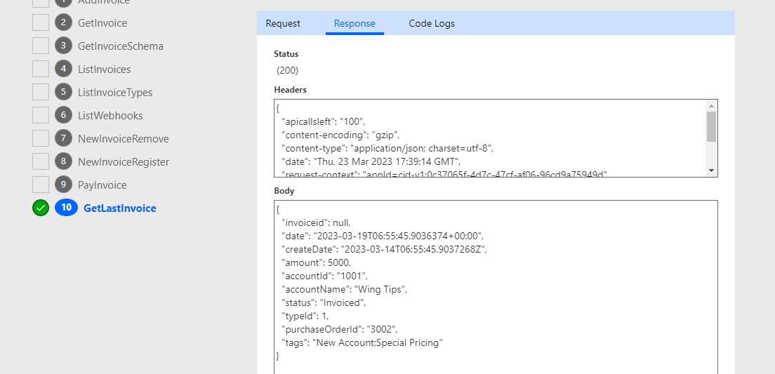 { "invoiceId": "1934", "date": "2023-03-19T06:55:45.9039452+00:00", "createDate": "2023-03-14T06:55:45.9039456Z", "amount": 8000, "accountId": "1001", "accountName": "Wing Tips", "status": "Invoiced", "typeId": 1, "purchaseOrderId": "3004", "tags": "New Account;Special Pricing;Non-returnable" }Select the Test tab, select Update connector, and then wait for the update to complete.