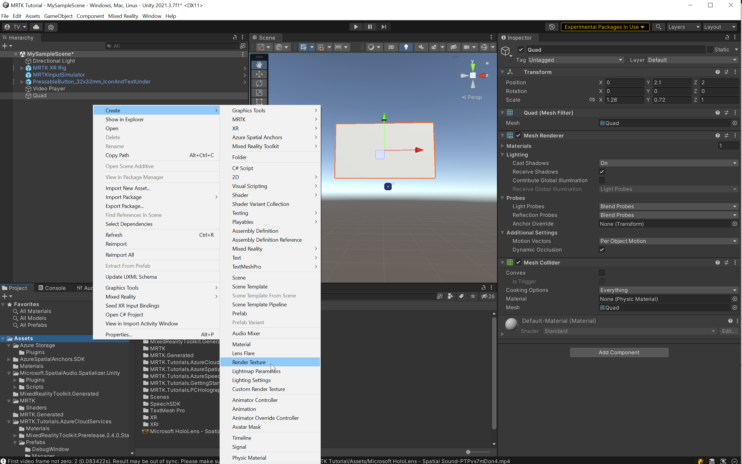 Nu moet u de Quad van textuur voorzien met de video. Klik met de rechtermuisknop in het venster Project en kies >Bitmappatroon maken om een onderdeel Bitmappatroon weergeven te maken. Voer een geschikte naam in voor de Render Texture; bijvoorbeeld Spatial Audio Texture.