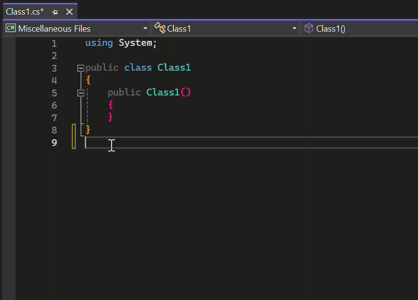 Als u de lege constructor die voor Class1 is gegenereerd niet wilt zien, kunt u deze samenvouwen om het overzicht van de code te verbeteren. Selecteer het caretteken in de marge van de eerste regel van de constructor. Als u het toetsenbord liever gebruikt, plaatst u de cursor ergens in de constructorcode en selecteert u de Ctrl+M-, Ctrl+M toetsen.