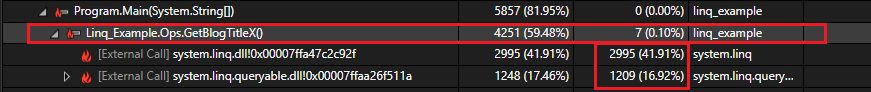 GetBlogTitleX maakt externe aanroepen naar twee LINQ-DLL's, die de meeste CPU-tijd gebruiken, zoals wordt aangetoond door de zeer hoge self-CPU- waarden. Dit is de eerste aanwijzing dat een LINQ-query mogelijk een gebied is om te optimaliseren.