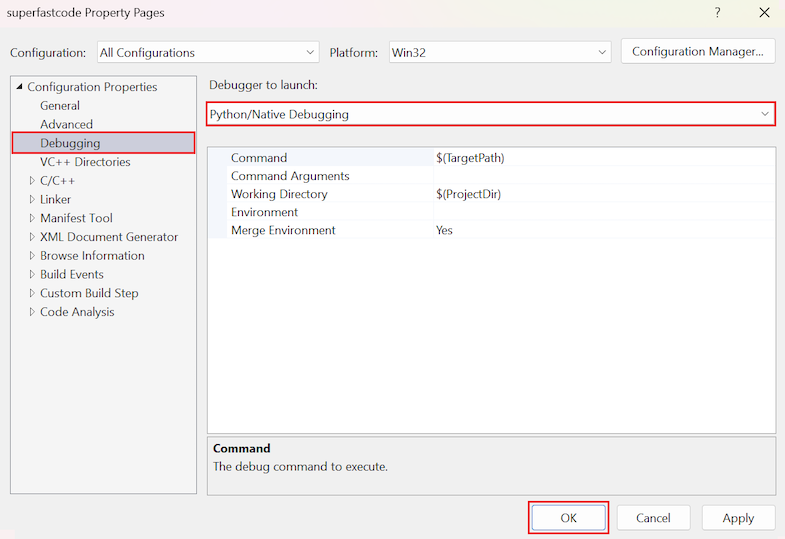 Als u de optie Python/Systeemeigen foutopsporing niet ziet, moet u eerst de systeemeigen Python-ontwikkelhulpprogramma's installeren met behulp van het Installatieprogramma van Visual Studio. De systeemeigen foutopsporingsoptie is beschikbaar onder de Python-ontwikkelworkload. Zie Python-ondersteuning installeren in Visual Studiovoor meer informatie.