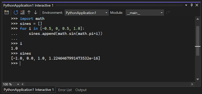 Voor elke Python-omgeving die bekend is bij Visual Studio, kunt u eenvoudig dezelfde interactieve (REPL)-omgeving openen voor een Python-interpreter rechtstreeks in Visual Studio, in plaats van een afzonderlijke opdrachtprompt te gebruiken. U kunt ook eenvoudig schakelen tussen omgevingen. Als u een afzonderlijke opdrachtprompt wilt openen, selecteert u de gewenste omgeving in het venster Python-omgevingen en selecteert u vervolgens de opdracht Openen in PowerShell, zoals eerder is uitgelegd in de sectie Ondersteuning voor meerdere interpreters.