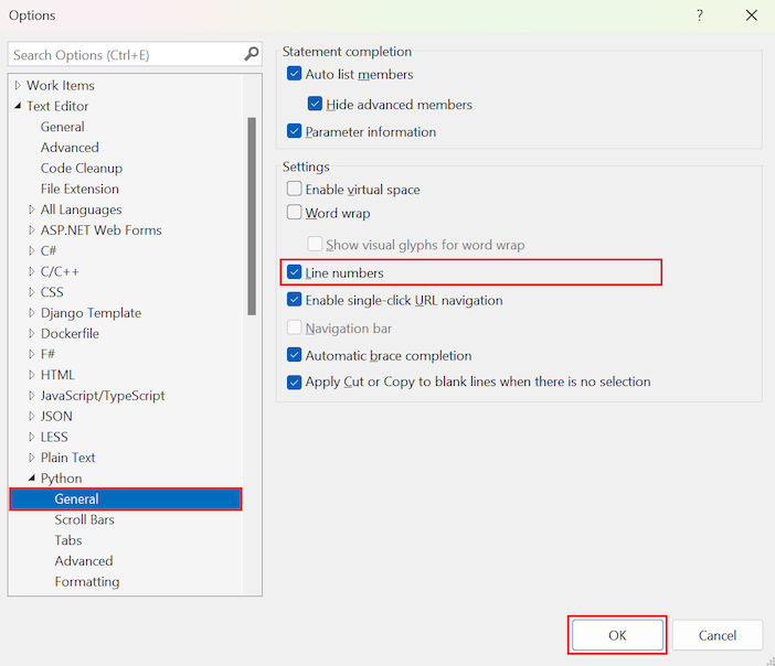Regelnummers worden standaard niet weergegeven in de editor. Als u de regelnummers wilt zien, selecteert u Extra>opties, vouwt u de sectie Alle instellingentaal>>Python>Algemeen uit en selecteert u de optie Regelnummers: