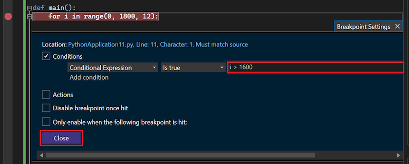 Het doorlopen van honderden iteraties van een lus kan tijdrovend zijn, zodat u in Visual Studio een voorwaarde kunt toevoegen aan een onderbrekingspunt. Wanneer u een voorwaarde voor een onderbrekingspunt instelt, onderbreekt het foutopsporingsprogramma het programma alleen op het onderbrekingspunt wanneer aan de voorwaarde is voldaan.