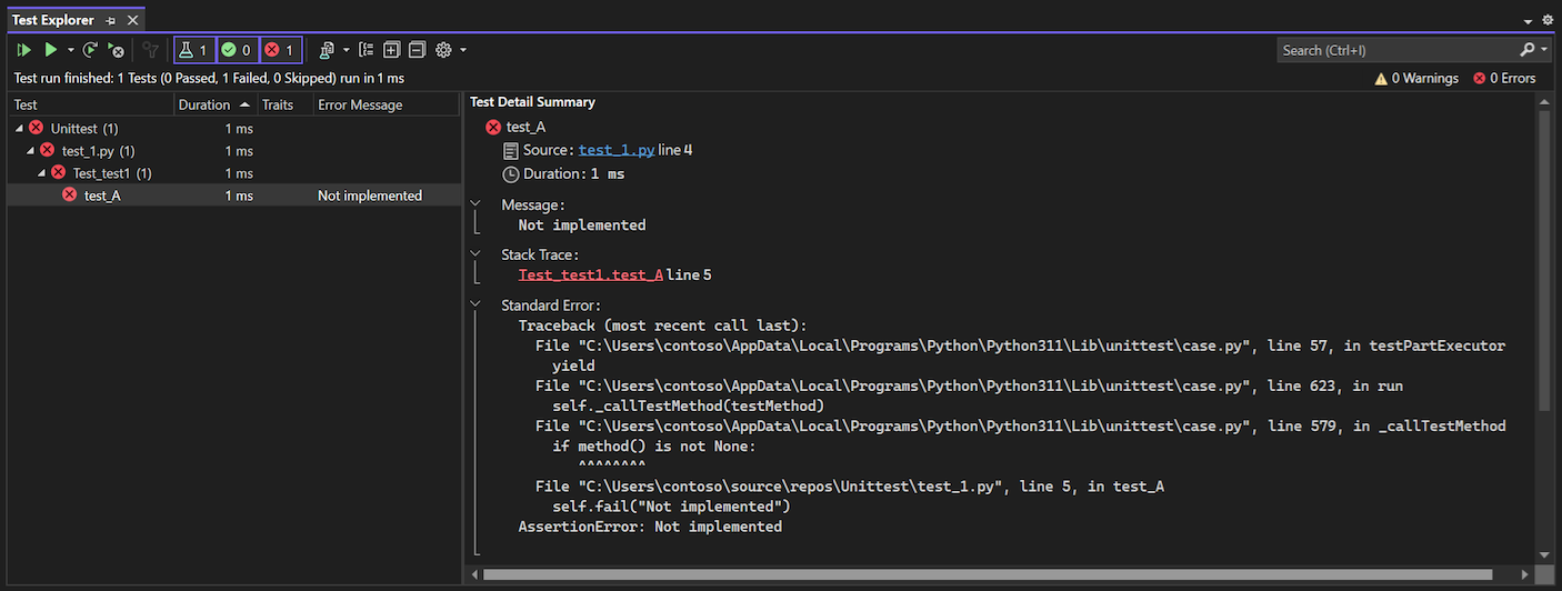 Dit artikel bevat een kort overzicht van de mogelijkheden voor het testen van eenheden in Visual Studio met Python. Zie Eenheidstest uw code voor meer informatie over eenheidstests in het algemeen.