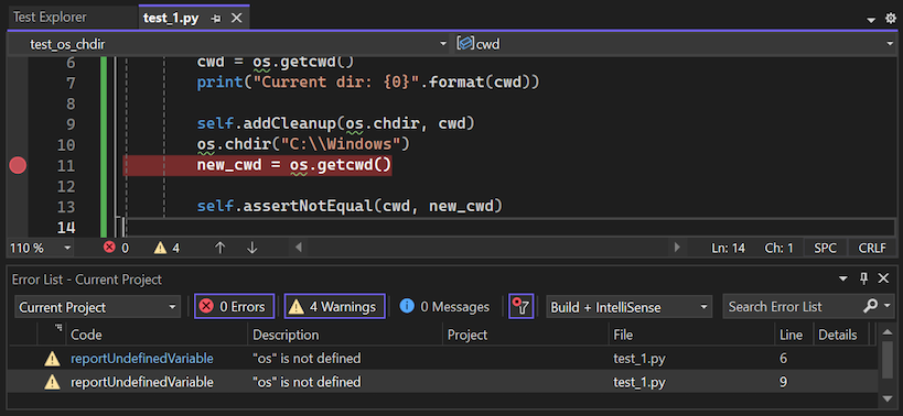 Python gebruikt moduletests uitgebreid om scenario's te valideren tijdens het ontwerpen van een programma. Python-ondersteuning in Visual Studio omvat het detecteren, uitvoeren en foutopsporing van eenheidstests binnen de context van uw ontwikkelproces, zonder dat u tests afzonderlijk hoeft uit te voeren.