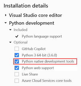 Zie Python-ondersteuning voor Visual Studio installeren voor meer informatie over de installatieopties.