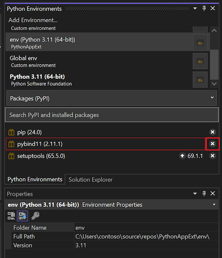 pipopdracht uitvoeren in de Python-omgeving die is geactiveerd voor uw Python-project. Wanneer u de actieve Python-omgeving voor uw project uitvouwt in Solution Explorer, ziet u een vermelding voor het C++-project, zoals superfaste code.