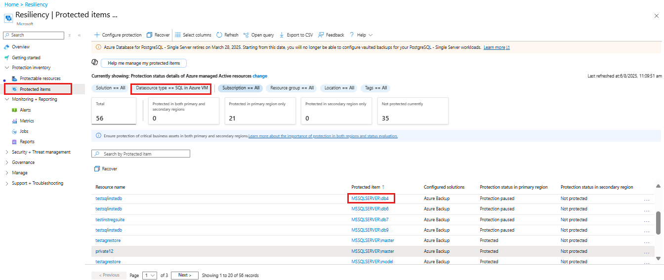 Usługa Azure Backup pokazuje wszystkie zaplanowane i na żądanie operacje w obszarze Zadania w Odporność w witrynie Azure Portal, z wyjątkiem zaplanowanych kopii zapasowych dzienników, ponieważ mogą być bardzo częste. Zadania widoczne w tym portalu obejmują operacje odnajdywania i rejestrowania bazy danych, konfigurowania kopii zapasowych oraz tworzenia kopii zapasowych i przywracania.
