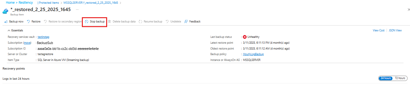 - Zatrzymaj ochronę i usuń dane kopii zapasowej: zatrzymuje przyszłe zadania tworzenia kopii zapasowej bazy danych programu SQL Server i usuwa wszystkie dane kopii zapasowej. Nie można przywrócić bazy danych programu SQL Server ani użyć opcji Wznów tworzenie kopii zapasowej .
