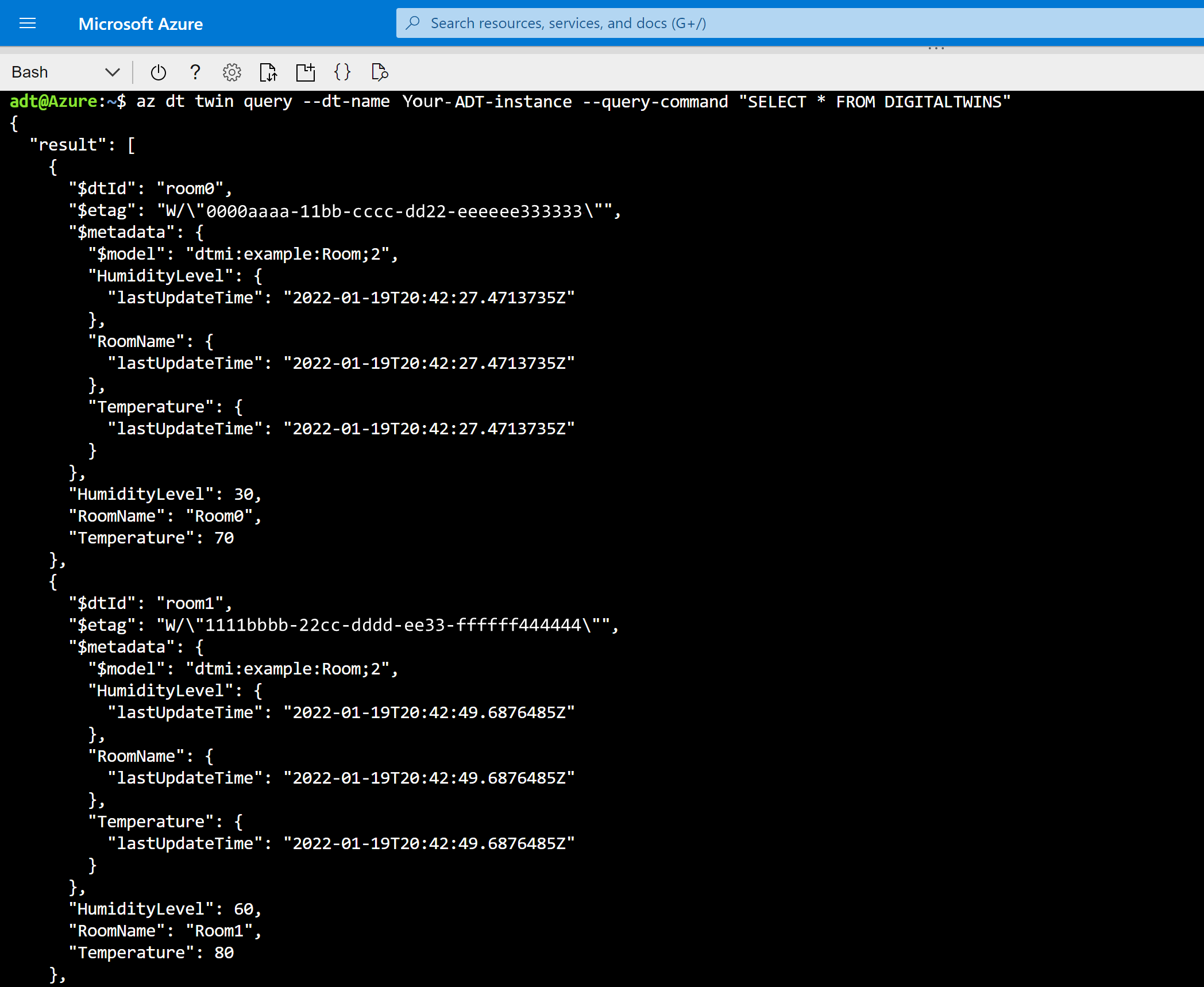 RoomNamew wyniku.Możesz sprawdzić, czy aktualizacja powiodła się, uruchamiając polecenie az dt twin show , aby wyświetlić informacje o pokoju0. Jest jeden symbol zastępczy dla nazwy hosta instancji (można również użyć przyjaznej nazwy instancji, co wiąże się z niewielkim spadkiem wydajności).