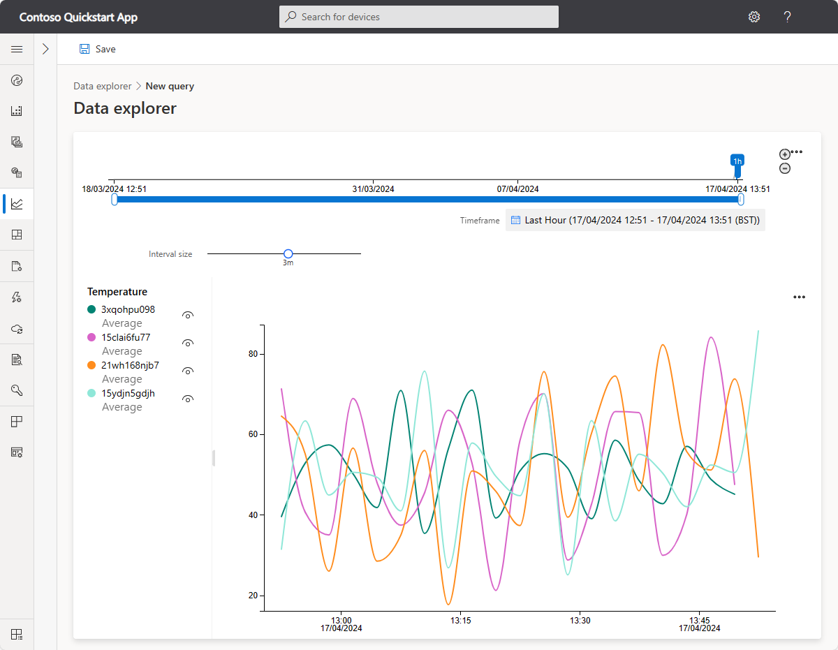 Eksplorator danych z grupą urządzeń umożliwia analizowanie danych telemetrycznych z urządzeń w grupie. Możesz na przykład wykreślić średnią temperaturę zgłoszoną przez wszystkie czujniki środowiskowe firmy Contoso.