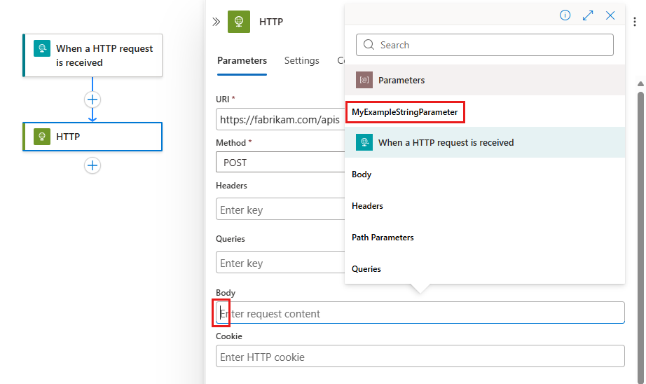 Aby odwołać się do parametru z wyzwalacza lub akcji w dowolnym przepływie pracy dla tej samej aplikacji logiki, wykonaj następujące kroki: