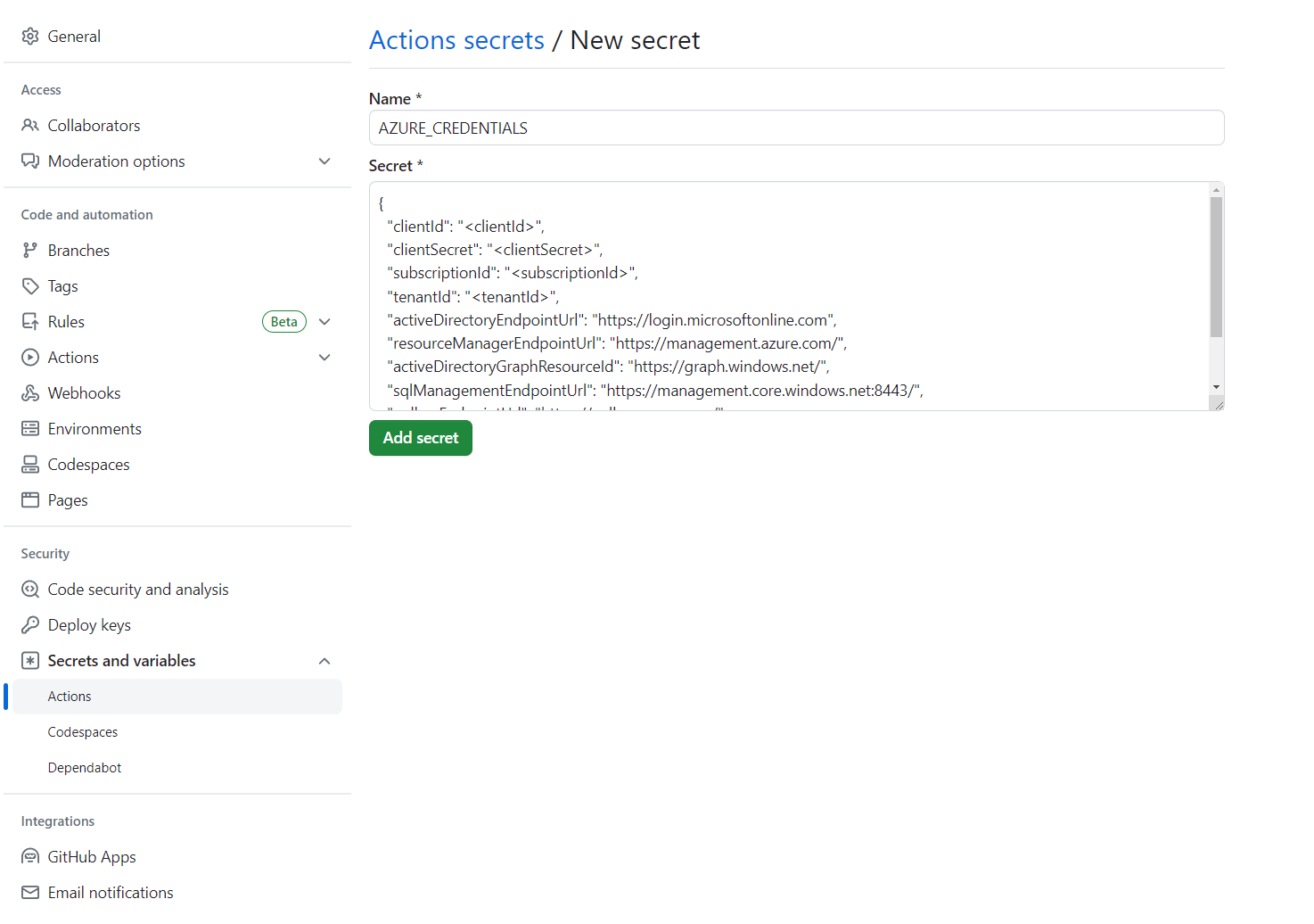Ustaw nazwę sekretną na AZURE_CREDENTIALS i jego wartość na ciąg JSON znaleziony pod nagłówkiem Konfigurowanie repozytorium GitHub i uwierzytelnianie.