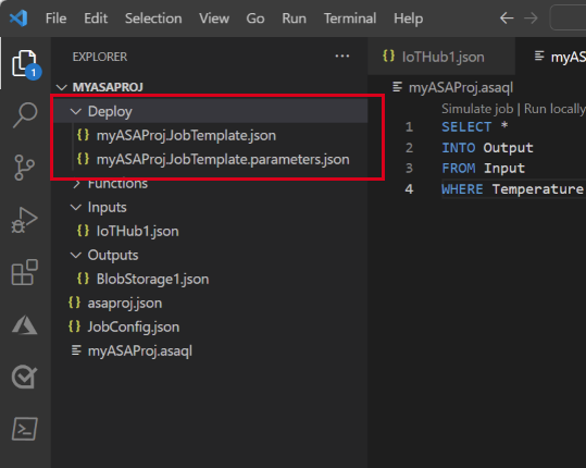 Projekt ASA jest dodawany do obszaru roboczego. Składa się z trzech folderów: Dane wejściowe, Dane wyjściowe i Funkcje. Zawiera również skrypt zapytania (*.asaql), plik JobConfig.json i plik konfiguracji asaproj.json.
