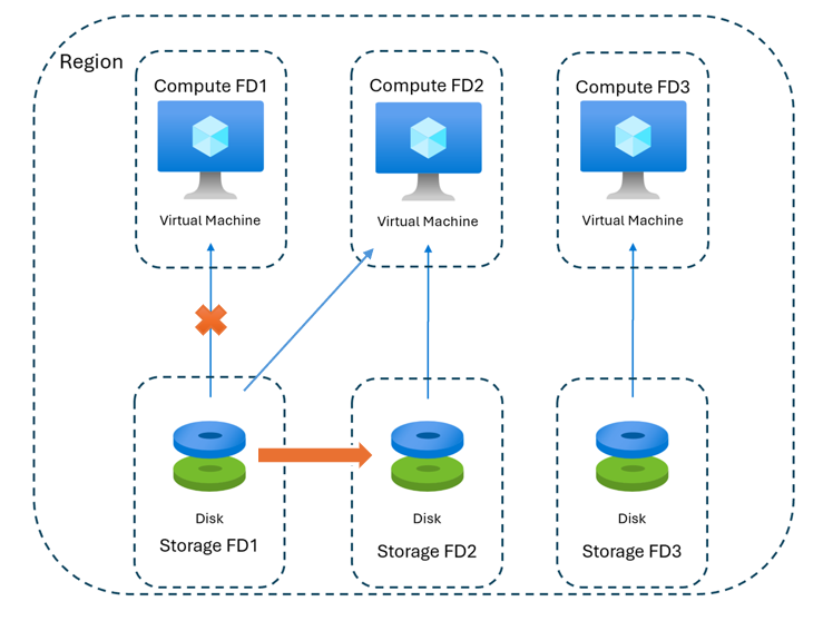 Jak pokazano na poprzednim diagramie, jeśli dysk znajdujący się w domenie uszkodzeń 1 jest dołączony do maszyny wirtualnej w domenie uszkodzeń 1 i zostanie później odłączony i ponownie dołączony do maszyny wirtualnej w domenie uszkodzeń 2, system automatycznie powoduje kopię dysku w tle, aby przenieść go z domeny uszkodzeń 1 do domeny uszkodzeń 2 w celu wyrównania domen obliczeniowych i magazynowych. Ukończenie tego procesu przenoszenia w tle może potrwać do 24 godzin.
