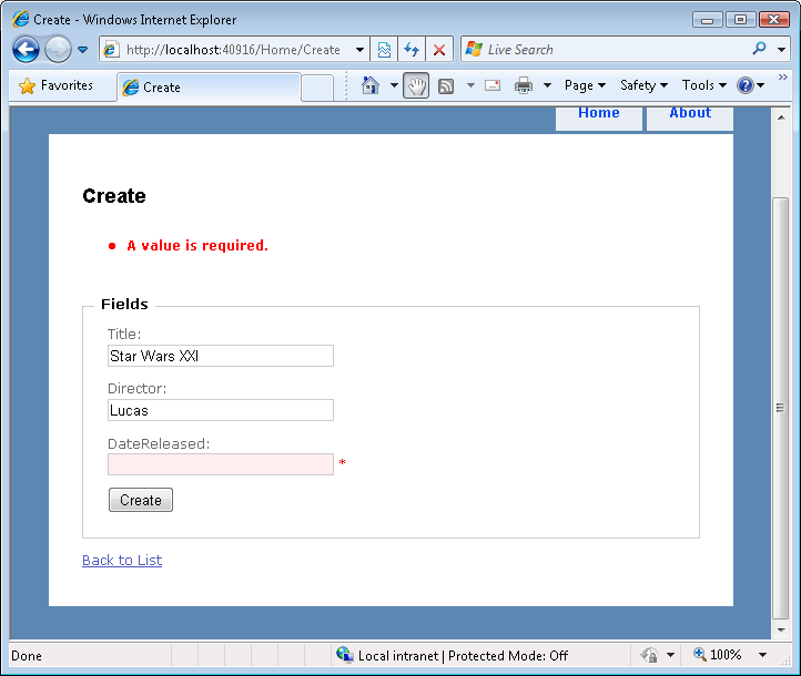 Zwróć uwagę, że automatycznie uzyskujesz walidację formularza. Jeśli nie wprowadzisz daty wydania filmu lub wprowadzisz nieprawidłową datę wydania, formularz zostanie odtworzona, a pole data wydania zostanie wyróżnione.