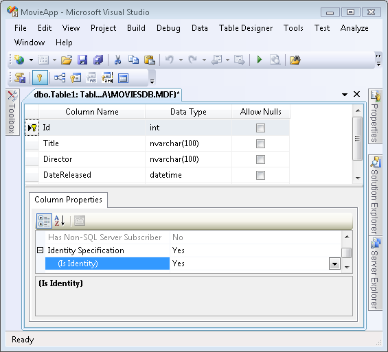 Pierwsza kolumna, kolumna Id, ma dwie właściwości specjalne. Najpierw musisz oznaczyć kolumnę Id jako kolumnę klucza podstawowego. Po wybraniu kolumny Id kliknij przycisk Ustaw klucz podstawowy (jest to ikona, która wygląda jak klucz). Po drugie musisz oznaczyć kolumnę Id jako kolumnę Tożsamość. W okno Właściwości kolumny przewiń w dół do sekcji Specyfikacja tożsamości i rozwiń ją. Zmień właściwość Is Identity na wartość Tak. Po zakończeniu tabela powinna wyglądać jak Rysunek 4.