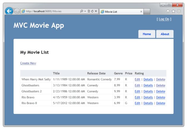 Uruchom ponownie aplikację i przejdź do adresu URL /Movies . Po uruchomieniu aplikacji wykrywa ona, że struktura modelu nie jest już zgodna ze schematem bazy danych. Automatycznie tworzy ponownie bazę danych w celu dopasowania jej do nowej struktury modelu i wypełnia bazę danych przykładowymi filmami:
