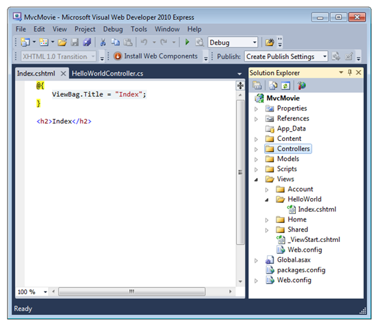 Zacznij od użycia szablonu widoku z Index metodą w HelloWorldController klasie . Index Obecnie metoda zwraca ciąg z komunikatem, który jest zakodowany w klasie kontrolera. Zmień metodę View , Index aby zwrócić obiekt, jak pokazano poniżej: