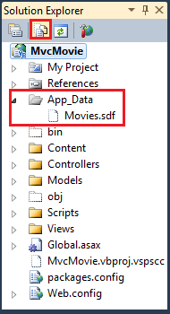 Program Entity Framework Code First wykrył, że baza danych parametry połączenia, która została podana, wskazywała Movies na bazę danych, która jeszcze nie istnieje, więc program Code First automatycznie utworzył bazę danych. Możesz sprawdzić, czy został on utworzony, patrząc w folderze App_Data . Jeśli nie widzisz pliku Movies.sdf, kliknij przycisk Pokaż wszystkie pliki na pasku narzędzi Eksplorator rozwiązań, kliknij przycisk Odśwież, a następnie rozwiń folder App_Data.