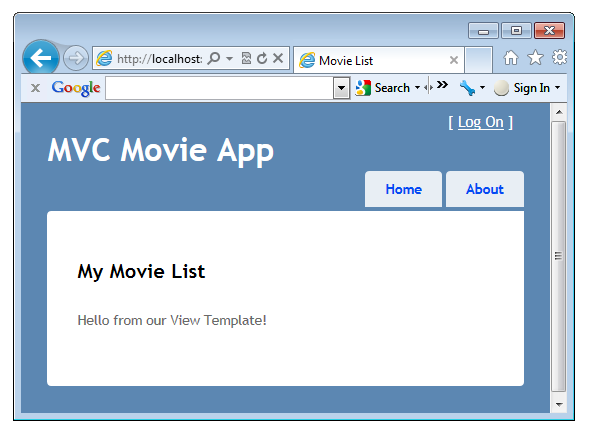 Uruchom aplikację i zanotuj, że teraz jest wyświetlany komunikat "MVC Movie App". Kliknij link Informacje, a na tej stronie jest również wyświetlana opcja "Aplikacja filmowa MVC".