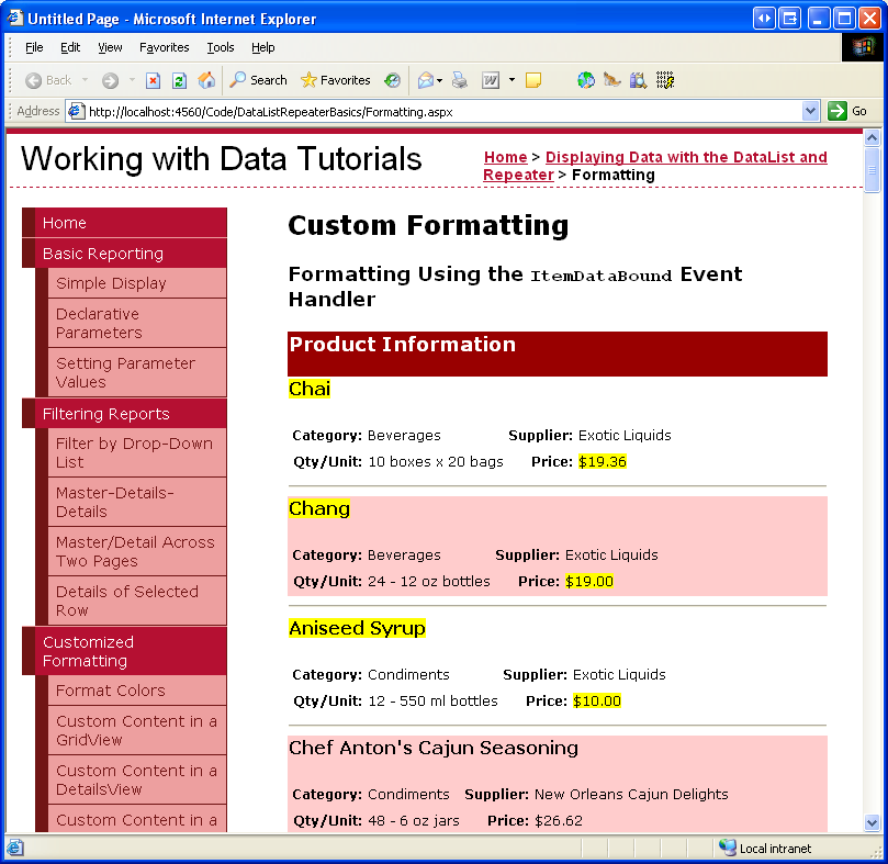 pl-PL: Gdy już zreplikujesz funkcje DataList i ObjectDataSource z Basics.aspx do Formatting.aspx, poświęć chwilę na zmianę właściwości DataList ID z DataList1 na bardziej opisowe ItemDataBoundFormattingExample. Następnie wyświetl element DataList w przeglądarce. Jak pokazano na rysunku 1, jedyną różnicą formatowania między poszczególnymi produktami jest to, że kolor tła jest alternatywny.