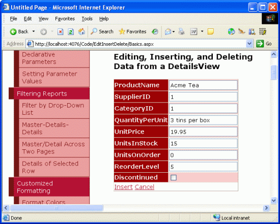 <asp:DetailsView ID="DetailsView1" runat="server" AutoGenerateRows="False" DataKeyNames="ProductID" DataSourceID="ObjectDataSource1" AllowPaging="True"> <Fields> <asp:BoundField DataField="ProductID" HeaderText="ProductID" InsertVisible="False" ReadOnly="True" SortExpression="ProductID" /> <asp:BoundField DataField="ProductName" HeaderText="ProductName" SortExpression="ProductName" /> <asp:BoundField DataField="SupplierID" HeaderText="SupplierID" SortExpression="SupplierID" /> <asp:BoundField DataField="CategoryID" HeaderText="CategoryID" SortExpression="CategoryID" /> <asp:BoundField DataField="QuantityPerUnit" HeaderText="QuantityPerUnit" SortExpression="QuantityPerUnit" /> <asp:BoundField DataField="UnitPrice" HeaderText="UnitPrice" SortExpression="UnitPrice" /> <asp:BoundField DataField="UnitsInStock" HeaderText="UnitsInStock" SortExpression="UnitsInStock" /> <asp:BoundField DataField="UnitsOnOrder" HeaderText="UnitsOnOrder" SortExpression="UnitsOnOrder" /> <asp:BoundField DataField="ReorderLevel" HeaderText="ReorderLevel" SortExpression="ReorderLevel" /> <asp:CheckBoxField DataField="Discontinued" HeaderText="Discontinued" SortExpression="Discontinued" /> <asp:BoundField DataField="CategoryName" HeaderText="CategoryName" ReadOnly="True" SortExpression="CategoryName" /> <asp:BoundField DataField="SupplierName" HeaderText="SupplierName" ReadOnly="True" SortExpression="SupplierName" /> <asp:CommandField ShowDeleteButton="True" ShowEditButton="True" ShowInsertButton="True" /> </Fields> </asp:DetailsView>