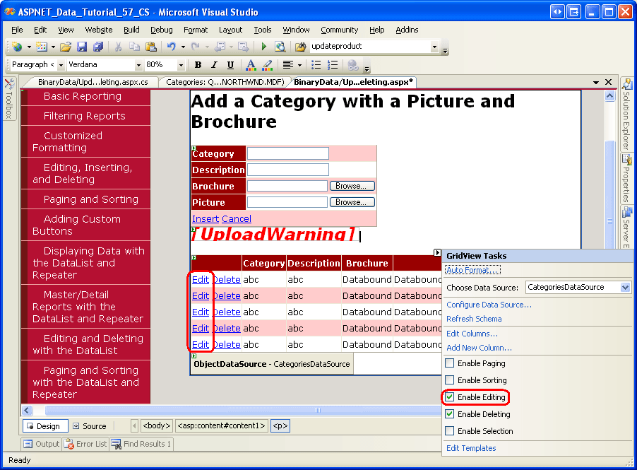 W poprzednim samouczku utworzyliśmy stronę o nazwie UploadInDetailsView.aspx, która wyświetliła wszystkie kategorie w kontrolce GridView i zapewniła kontrolkę DetailsView do dodawania nowych kategorii do systemu. W tym samouczku rozszerzymy element GridView, aby dodać obsługę edytowania i usuwania. Zamiast kontynuować pracę z UploadInDetailsView.aspx, umieśćmy zmiany w tym samouczku na stronie UpdatingAndDeleting.aspx z tego samego folderu ~/BinaryData. Skopiuj i wklej deklaratywne znaczniki i kod z UploadInDetailsView.aspx do UpdatingAndDeleting.aspx.