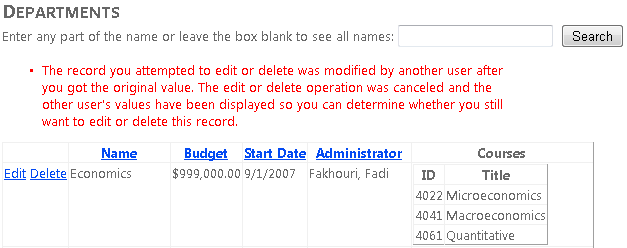 Kliknij pozycję Edytuj w wierszu i zmień wartość w kolumnie Budżet . Pamiętaj, że możesz edytować tylko rekordy utworzone na potrzeby tego samouczka, ponieważ istniejące School rekordy bazy danych zawierają nieprawidłowe dane. Rekord dla działu ekonomii jest bezpieczny do eksperymentowania z.)