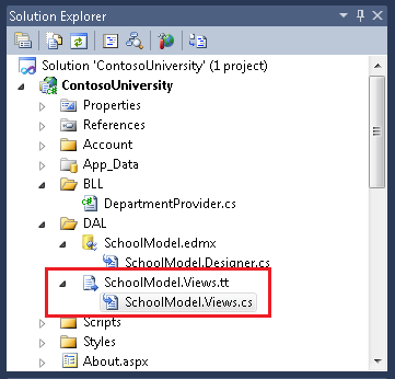 Program Visual Studio generuje plik kodu, który tworzy widoki o nazwie SchoolModel.Views.cs na podstawie szablonu. (Być może zauważysz, że plik kodu jest generowany nawet przed wybraniem polecenia Uruchom narzędzie niestandardowe, gdy tylko zapiszesz plik szablonu).