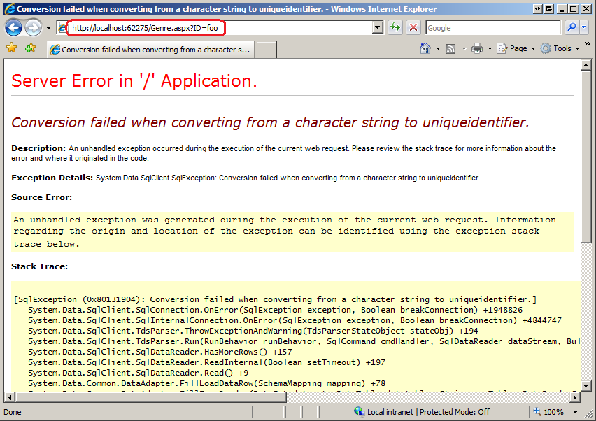 Aby odtworzyć ten błąd w demonstracyjnej aplikacji internetowej dostępnej do pobrania, możesz przejść Genre.aspx?ID=foo bezpośrednio lub kliknąć link "Generuj błąd czasu wykonania" w pliku Default.aspx.