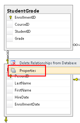 W Eksploratorze serwera otwórz diagram bazy danych utworzony w części 1. Kliknij prawym przyciskiem myszy relację między Person i StudentGrade (wiersz między tabelami), a następnie wybierz polecenie Właściwości.