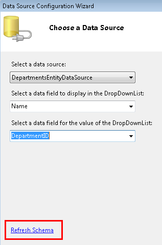 W kroku Wybierz źródło danych wybierz pozycję DepartmentsEntityDataSource jako źródło danych, kliknij pozycję Odśwież schemat, a następnie wybierz pozycję Nazwa jako pole danych, aby wyświetlić pole danych i identyfikator działu jako pole danych wartości. Kliknij przycisk OK.