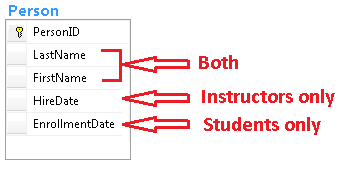 Baza danych może przechowywać informacje o powiązanych obiektach w jednej tabeli lub w wielu tabelach. Na przykład w School bazie danych Person tabela zawiera informacje o uczniach i instruktorach w jednej tabeli. Niektóre kolumny dotyczą tylko instruktorów (HireDate), niektórych tylko dla uczniów (EnrollmentDate), a niektóre do obu (LastName, FirstName).