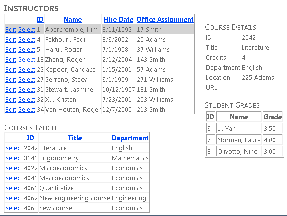 EntityTypeFilter="Instructor"element do kontrolkiInstructorsEntityDataSourcei usuń elementWhere="it.HireDate is not null". Znaczniki w pliku Instructors.aspx są teraz podobne do następującego przykładu:<asp:EntityDataSource ID="InstructorsEntityDataSource" runat="server" ContextTypeName="ContosoUniversity.DAL.SchoolEntities" EnableFlattening="false" EntitySetName="People" EntityTypeFilter="Instructor" Include="OfficeAssignment" EnableUpdate="True"> </asp:EntityDataSource>Znaczniki w pliku InstructorsCourses.aspx będą teraz podobne do następującego przykładu: