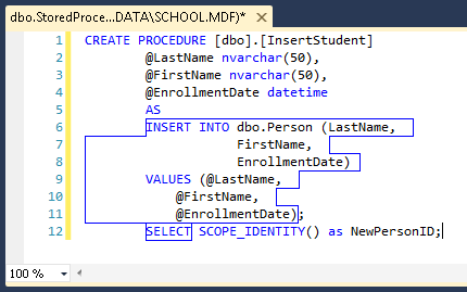 Studentjednostki mają cztery właściwości: PersonID, , FirstNameLastNamei EnrollmentDate. Baza danych automatycznie generuje wartość identyfikatora, a procedura składowana akceptuje parametry dla pozostałych trzech. Procedura składowana zwraca wartość klucza rekordu nowego wiersza, aby program Entity Framework mógł śledzić to w wersji jednostki przechowywanej w pamięci.